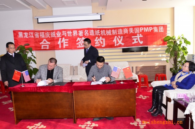 福慶紙業董事長李修志與美國pmp集團總裁艾倫-巴拉頓先生在簽約文件