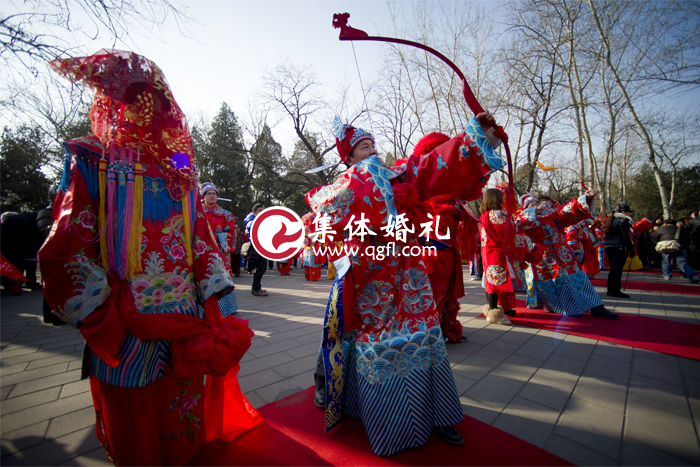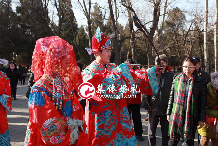 集體婚禮-中國集體婚禮網(wǎng)(www.www.1-jia.com.cn)舉辦的中式集體婚禮射箭環(huán)節(jié),是在抬花轎下轎前,新郎還得拉弓朝轎門射出3支紅箭,用來驅(qū)除新娘一路可能沾染的邪氣。一射天 天賜良緣 新人喜臨門 二 射地 地配以雙 新人百年好合 三箭定乾坤 先射天 再射地 地久天長 天長地久。