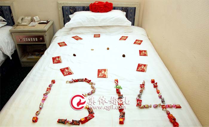 集體婚禮-中國集體婚禮網(www.www.1-jia.com.cn)舉辦的中式集體婚禮入洞房環節是婚禮儀式的最后一個環節,一般在司儀說完“有請新人入洞房嘍!!!”表示婚禮儀式部分結束。但是在集體婚禮上,新人來自全國各地,洞房是在最早的環節拍攝,在婚禮的頭一天,集體婚禮工作人員會提前為新人布置洞房,為新人講解婚禮注意事項,并且拍照攝像,歡樂的新人們用喜糖喜煙在床上擺放“1314”的字樣。第二天清晨化妝師在婚房為新人化妝,集體婚禮督導師和攝影攝像師傅有條不紊的工作著。所以中式集體婚禮的洞房有別于傳統婚禮洞房的環節,在眾多新人面前更增添了鬧洞房的熱鬧氣息。