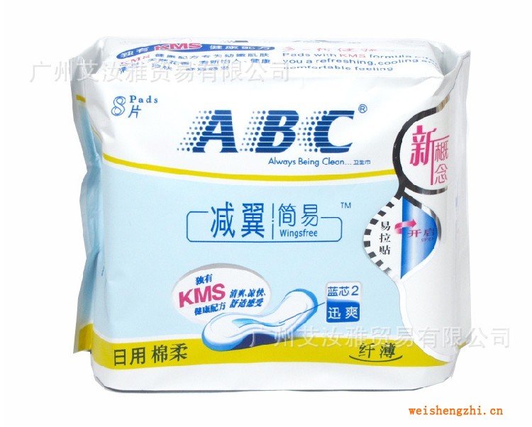 產品名稱:ABC衛生巾減翼簡易日用裝纖薄棉柔 包裝規格:8片/包 24包/箱