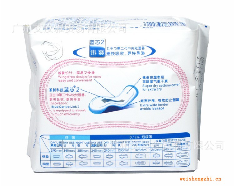 2、革新科技--藍芯2,衛生巾第二代中央處理器更快吸收,更快導滲。