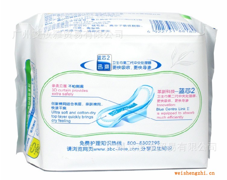 3、革新科技--藍芯2迅爽,衛生巾第二代中央處理器,更快吸收,更快導滲,將吸收和滲透加快3倍。