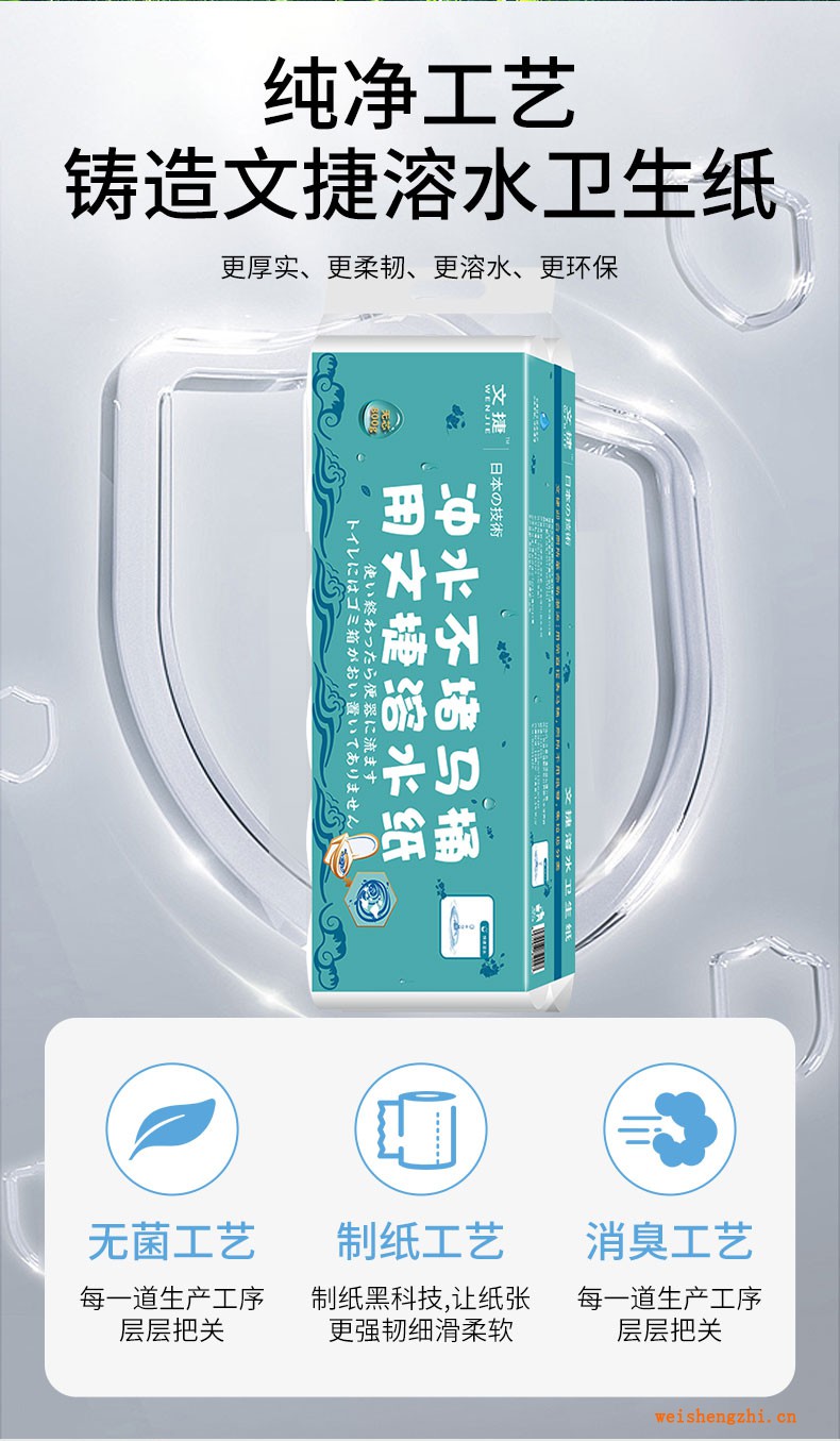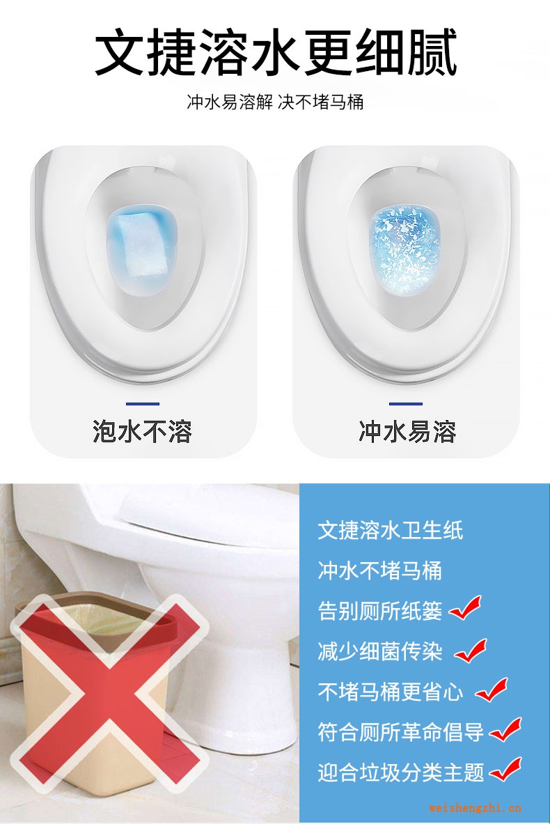 文捷易溶性衛生紙批發,國內一款不堵馬桶的衛生紙,在溶水衛生紙市場中獨樹一幟。文捷溶水衛生紙,沖水快速溶水,在馬桶沖力的作用下,能快速碎解 ,完全不會堵塞馬桶,文捷作為厚積薄發的品牌,會帶領溶水衛生紙市場。在當前國家提倡垃圾分類的大前提下,文捷衛生紙主動革新產品,升級衛生紙溶水性,做到國內快速溶水衛生紙很好的產品之一,先提出【免垃圾分類】,屬于【免垃圾分類的產品】。和傳統的衛生紙批發中紙品不同的是溶水性,很多消費者可能對衛生紙的溶水性的概念有些疑惑,說白了就是用完了丟入馬桶隨水沖走,不會堵塞馬桶。易溶性衛生紙批發商在經銷過程中也詳細突出這方面的優勢,溶水性同步日本國內衛生紙。(文捷溶水衛生紙免垃圾分類,沖水不堵馬桶,用文捷溶水紙)