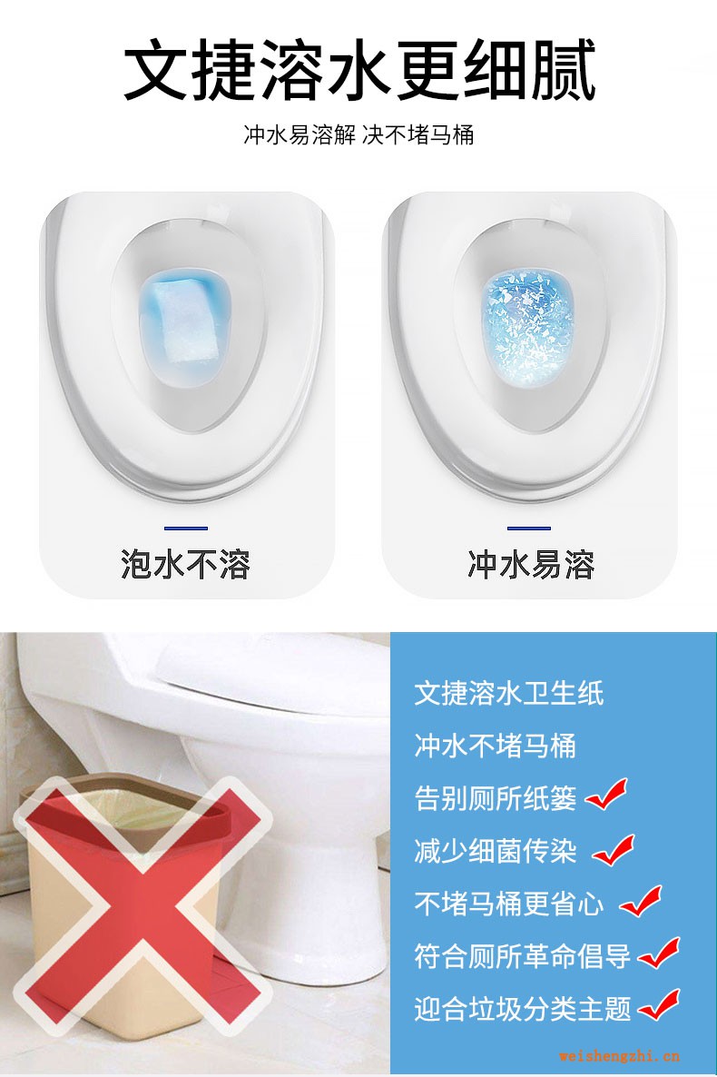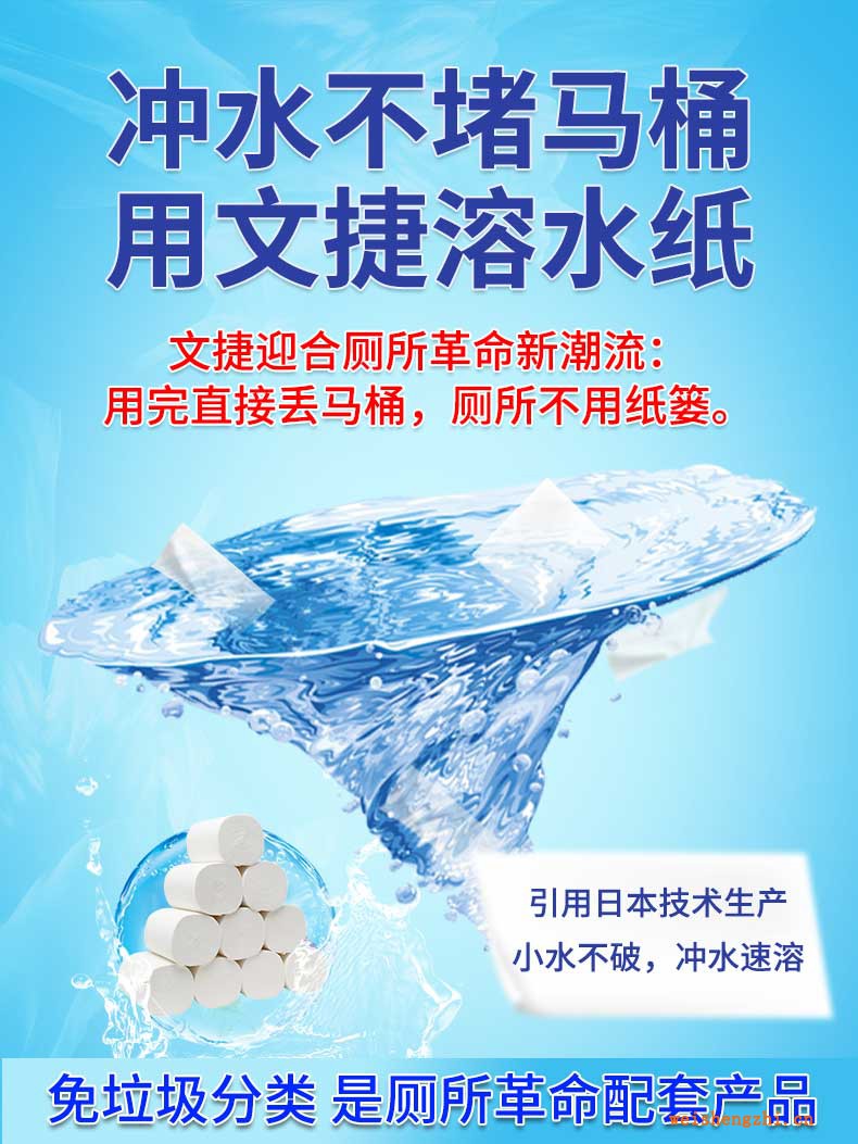 文捷易溶性衛生紙批發,國內一款不堵馬桶的衛生紙,在溶水衛生紙市場中獨樹一幟。文捷溶水衛生紙,沖水快速溶水,在馬桶沖力的作用下,能快速碎解 ,完全不會堵塞馬桶,文捷作為厚積薄發的品牌,會帶領溶水衛生紙市場。在當前國家提倡垃圾分類的大前提下,文捷衛生紙主動革新產品,升級衛生紙溶水性,做到國內快速溶水衛生紙很好的產品之一,先提出【免垃圾分類】,屬于【免垃圾分類的產品】。和傳統的衛生紙批發中紙品不同的是溶水性,很多消費者可能對衛生紙的溶水性的概念有些疑惑,說白了就是用完了丟入馬桶隨水沖走,不會堵塞馬桶。易溶性衛生紙批發商在經銷過程中也詳細突出這方面的優勢,溶水性同步日本國內衛生紙。(文捷溶水衛生紙免垃圾分類,沖水不堵馬桶,用文捷溶水紙)