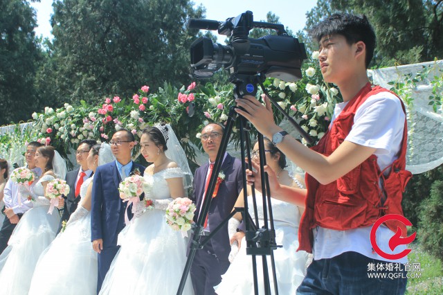 看看這熱鬧、浪漫、喜慶、和諧的畫面,臺上新人整齊排排站,臺下家屬、游客們有秩序觀看,中國集體婚禮工作人員穿插其中為每一對新人和親朋拍照、攝影留念。