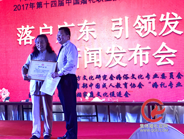 中國婚俗文化專業(yè)委員會主任劉秉季為廣東省攝影行業(yè)協(xié)會會長、廣東色色婚紗攝影有限公司董事長李建成先生頒發(fā)證書