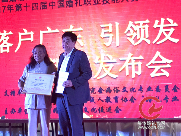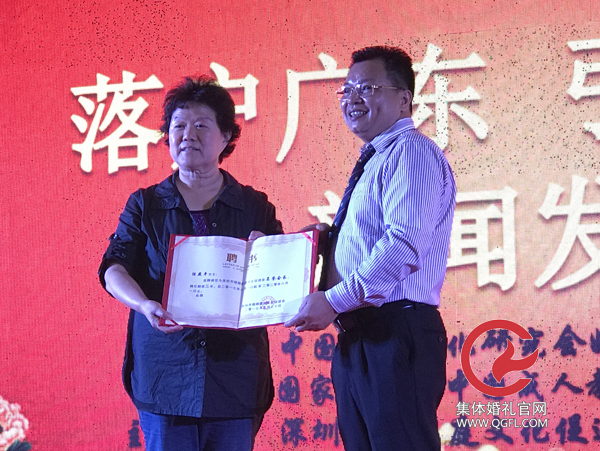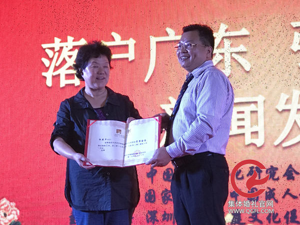中國婚俗文化專業(yè)委員會劉秉季主任向深圳市婚姻家庭文化促進會會長林東如先生頒發(fā)證書