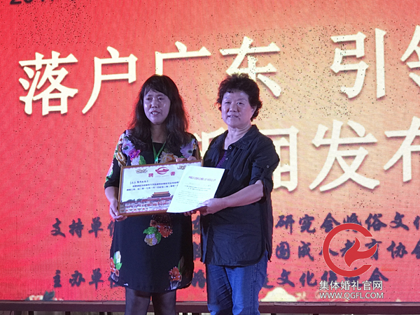 中國婚俗文化專業(yè)委員會常務(wù)主任陸燕平為深圳市婚姻家庭文化促進會秘書長李惠萍女士頒發(fā)證書