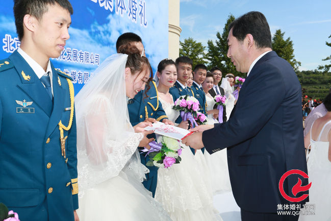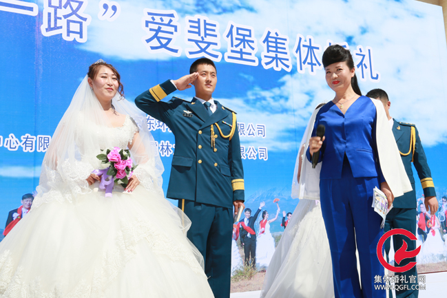 愛斐堡領導為集體婚禮新人頒發紀念證書,空軍戰士行軍禮。
