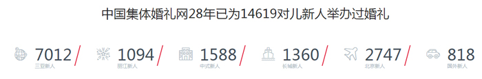 中國集體婚禮網(wǎng)北京總部,28年集體婚禮歷程。大數(shù)據(jù)統(tǒng)計(jì)14619對(duì)兒新人參加北京總部舉辦的集體婚禮。截止至今日,報(bào)名參加三亞集體婚禮的新人最多7012對(duì)兒。
