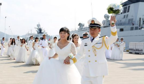 2015年9月26日,浙江舟山某軍港碼頭上,東海艦隊某驅逐艦支隊為27名推遲婚禮的官兵舉辦了第一屆集體婚禮。