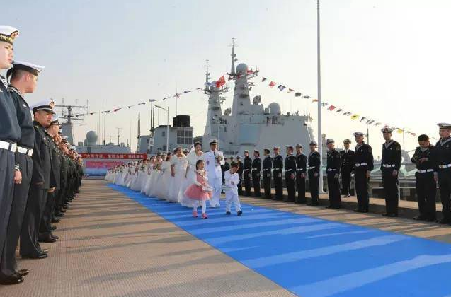 2017年12月5日,海艦隊某驅逐艦支隊軍港碼頭一片喜慶歡樂的氛圍,該支隊第三屆“大海作證 軍艦為媒”集體婚禮正在這里進行。36對因為任務推遲婚期的新人在大海和戰艦的見證下攜手一生。
