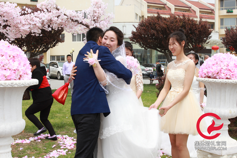 最特殊的細節。青島集體婚禮是西式婚禮儀式,但新娘不僅手拿“福袋”,頭上還蓋著“蓋頭”。現場有人認為不搭,西式就應該是西式的服裝搭配,不應該有中式的配飾。
