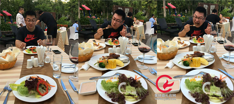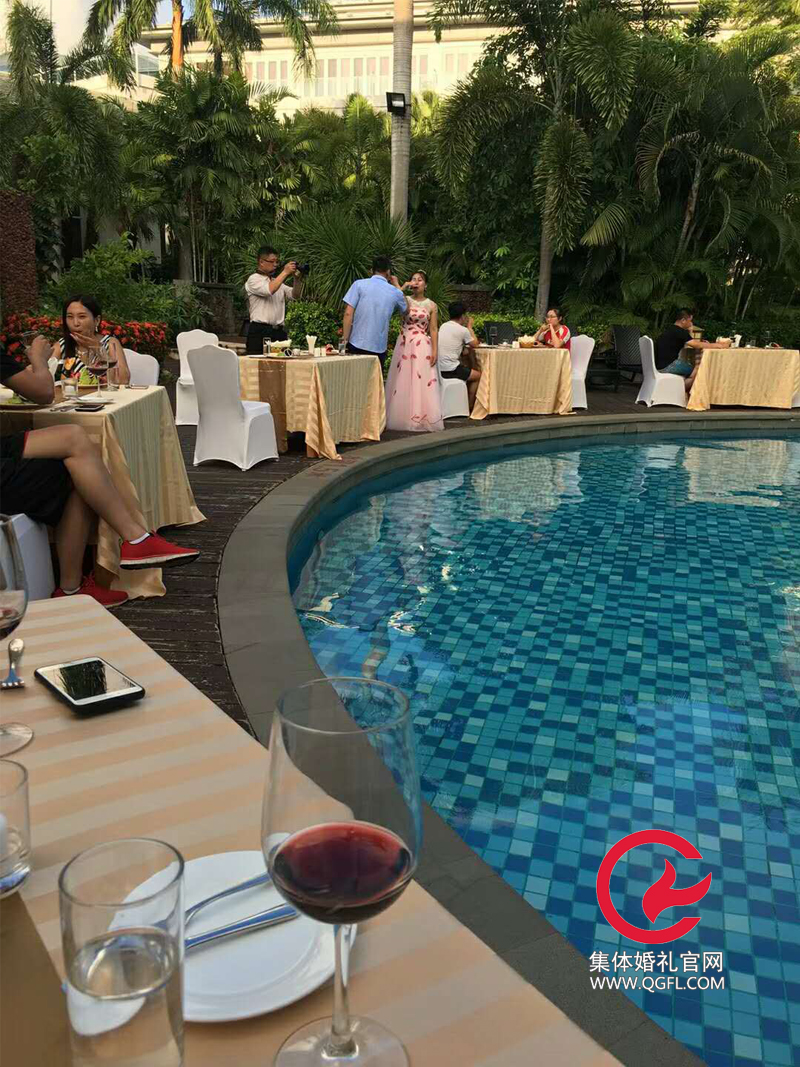 新人們白天經過新婚婚禮儀式的考驗,又在椰林、沙灘、海邊、汽車、風車、愛心樹等景觀拍了婚紗照,疲憊的一天已經進入黃昏,借著黃昏泳池泛起金光閃爍之際,中國集體婚禮網為新人們準備了泳池邊的燭光晚宴。紅酒,特色甜點,牛排海鮮等食物應有盡有,新人們在盡情放松享受燭光晚宴之時,攝影攝像師傅們還在不停歇的為新人們拍攝甜蜜瞬間。。。
